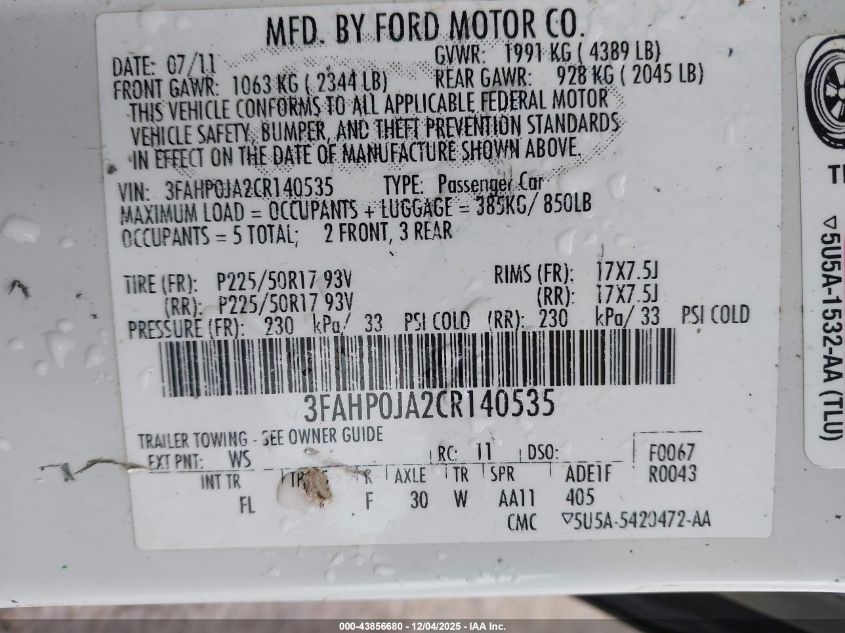 Колір БілийЦиліндри 4Привід Передній привідVIN 3FAHP0JA2CR140535Стан Заводиться та їде (перевірено)Ушкодження Звичайний знос AutoRIA