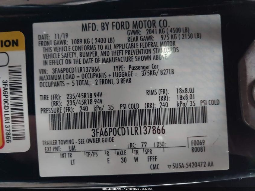 2020 FORD FUSION 2020 року Бензин, 1.5, Передній привід, vin - 3FA6P0CD1LR137866 з США