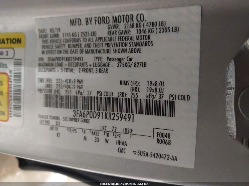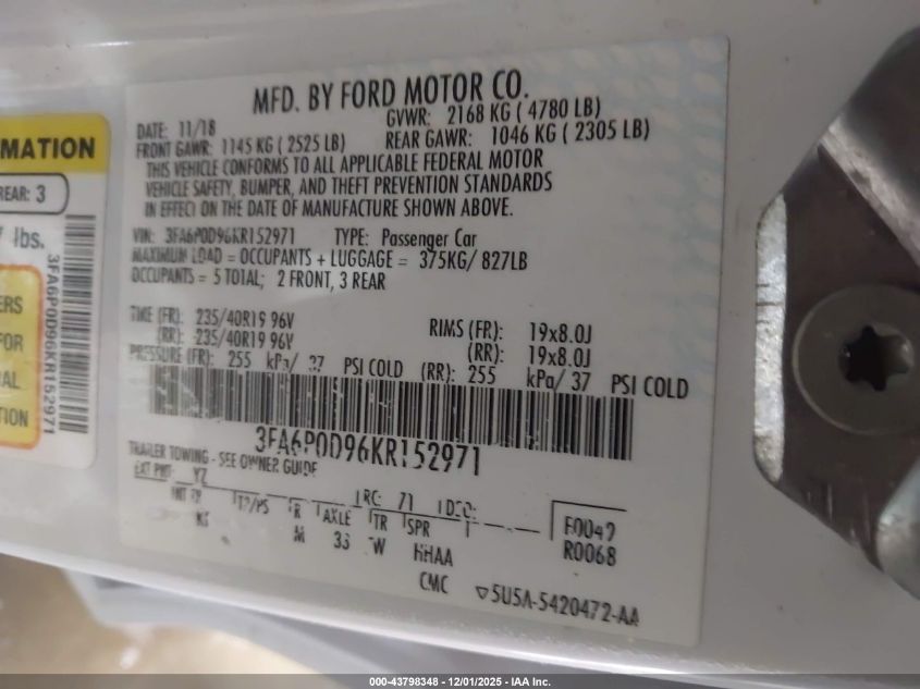 2019 FORD FUSION 2019 року Бензин, 2.0, Повний привід, vin - 3FA6P0D91KR259491 з США