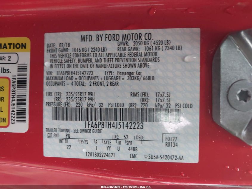 Колір ЧервонийЦиліндри 4Привід Задній привідVIN 1FA6P8TH4J5142223Стан Заводиться та їде (перевірено)Ушкодження Передня або задня AutoRIA