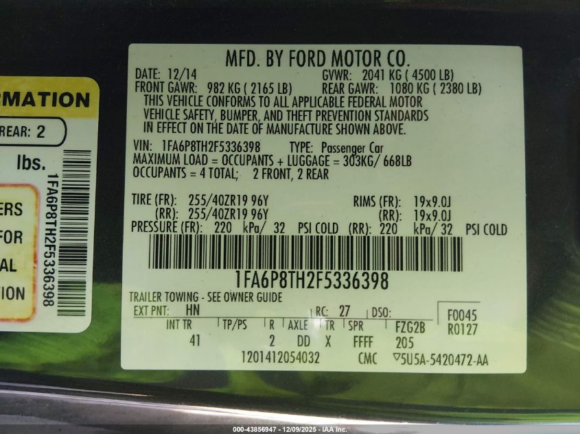 Колір СірийЦиліндри 4Привід Задній привідVIN 1FA6P8TH2F5336398Стан Заводиться та їде (перевірено)Ушкодження Права сторона AutoRIA