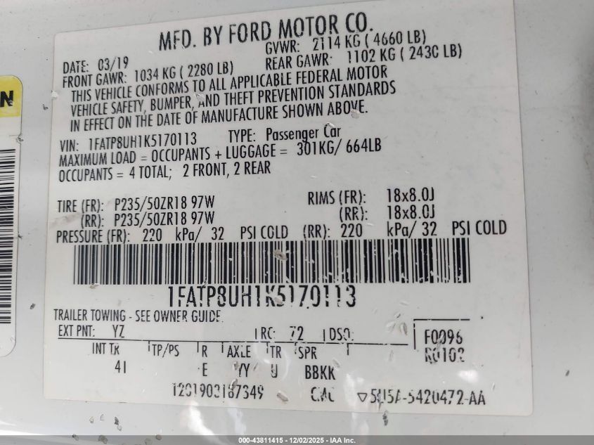 Колір БілийЦиліндри 4Привід Задній привідVIN 1FATP8UH1K5170113Стан СтаціонарноУшкодження Передня або задня AutoRIA