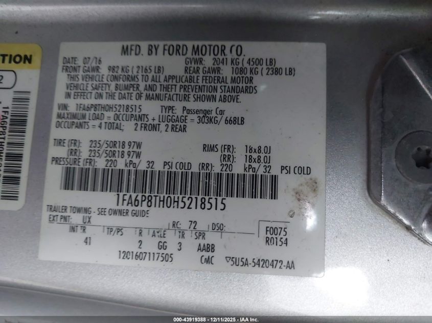 Колір СрібнийЦиліндри 4Привід Задній привідVIN 1FA6P8TH0H5218515Стан СтаціонарноУшкодження Передня або задня AutoRIA