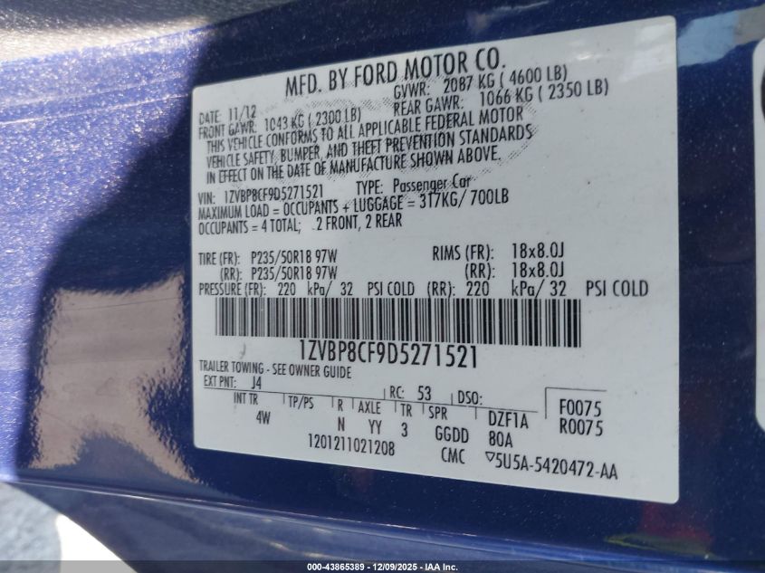 Колір СинійЦиліндри 8Привід Задній привідVIN 1ZVBP8CF9D5271521Стан СтаціонарноУшкодження Передня або задня AutoRIA