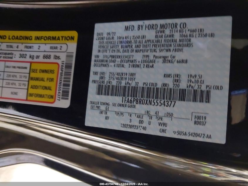 2022 FORD MUSTANG 2022 року Бензин, 5.0, Задній привід, vin - 1FA6P8R0XN5554377 з США