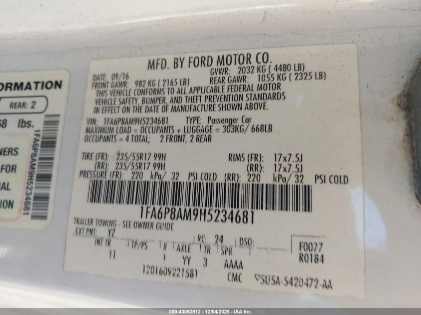 Колір БілийЦиліндри 6Привід Задній привідVIN 1FA6P8AM9H5234681Стан Заводиться та їде (перевірено)Ушкодження Права сторона AutoRIA