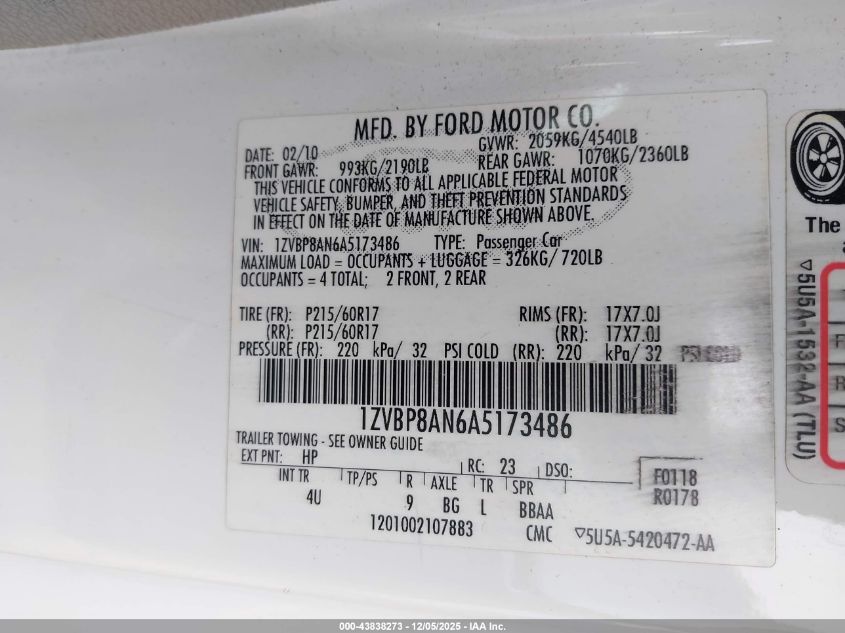 Колір БілийЦиліндри 6Привід Задній привідVIN 1ZVBP8AN6A5173486Стан СтаціонарноУшкодження Град AutoRIA