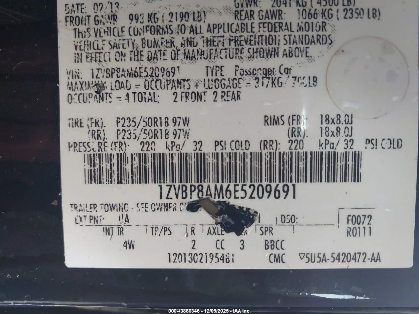 Колір ЧорнийЦиліндри 6Привід Задній привідVIN 1ZVBP8AM6E5209691Стан Заводиться та їде (перевірено)Ушкодження Передня або задня AutoRIA