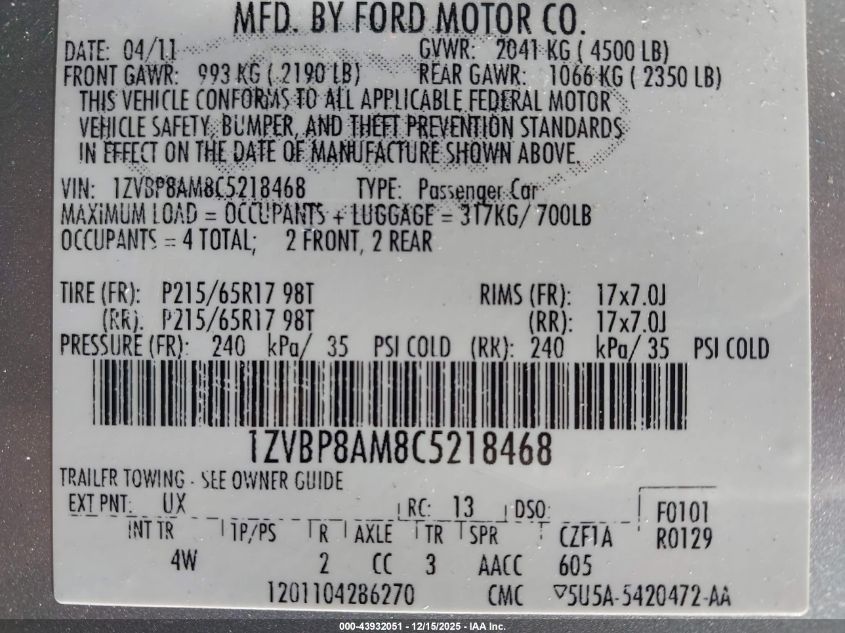 Колір СрібнийЦиліндри 6Привід Задній привідVIN 1ZVBP8AM8C5218468Стан Заводиться та їде (перевірено)Ушкодження Передня або задня AutoRIA