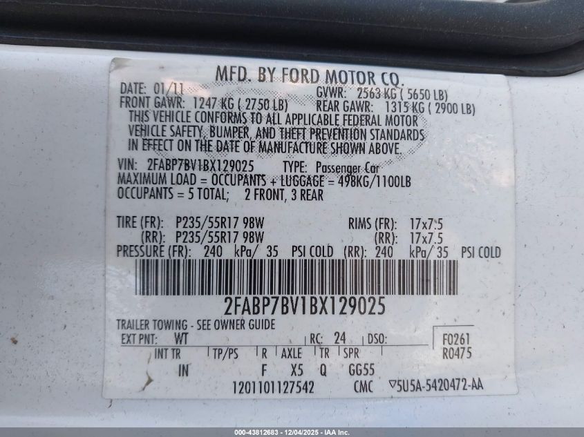 Колір БілийЦиліндри 8Привід Задній привідVIN 2FABP7BV1BX129025Стан Заводиться та їде (перевірено)Ушкодження Передня або задня