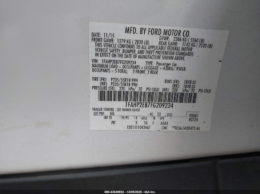 2015 FORD TAURUS 2015 року Бензин, 3.5, Передній привід, vin - 1FAHP2E87FG209234 з США
