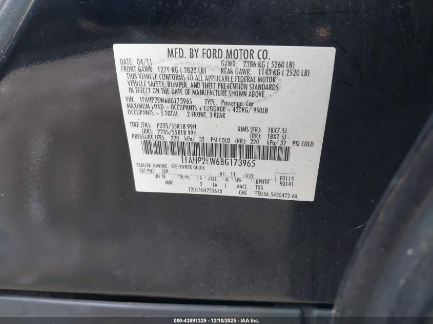 2011 FORD TAURUS 2011 року Бензин, 3.5, Передній привід, vin - 1FAHP2EW6BG173965 з США