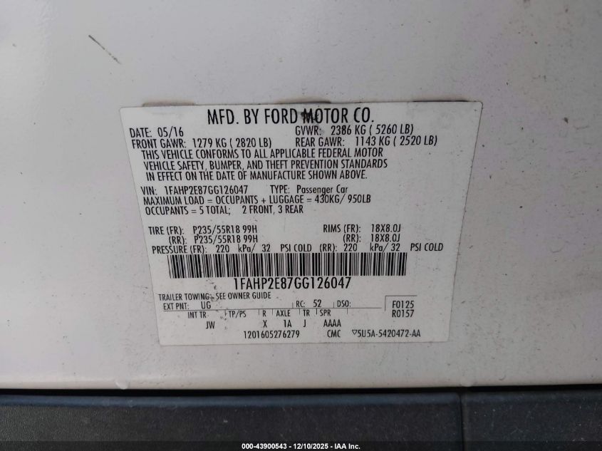 2016 FORD TAURUS 2016 року Бензин, 3.5, Передній привід, vin - 1FAHP2E87GG126047 з США