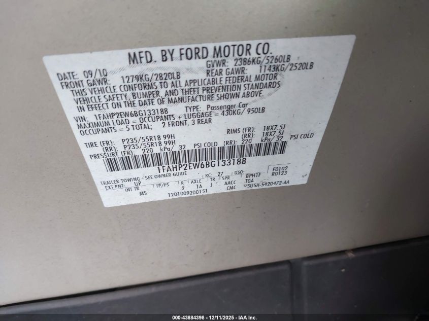 2011 FORD TAURUS 2011 року Бензин, 3.5, Передній привід, vin - 1FAHP2EW6BG133188 з США