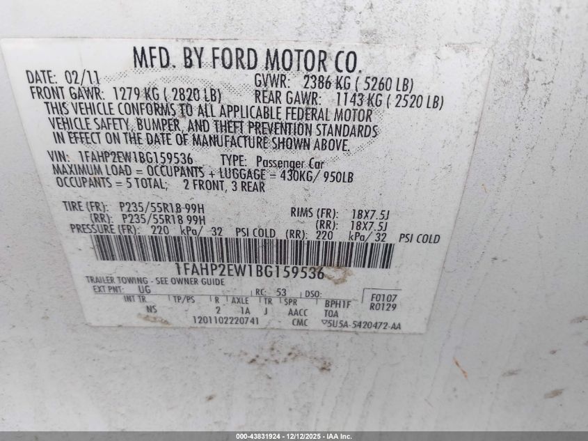 2011 FORD TAURUS 2011 року Бензин, 3.5, Передній привід, vin - 1FAHP2EW1BG159536 з США