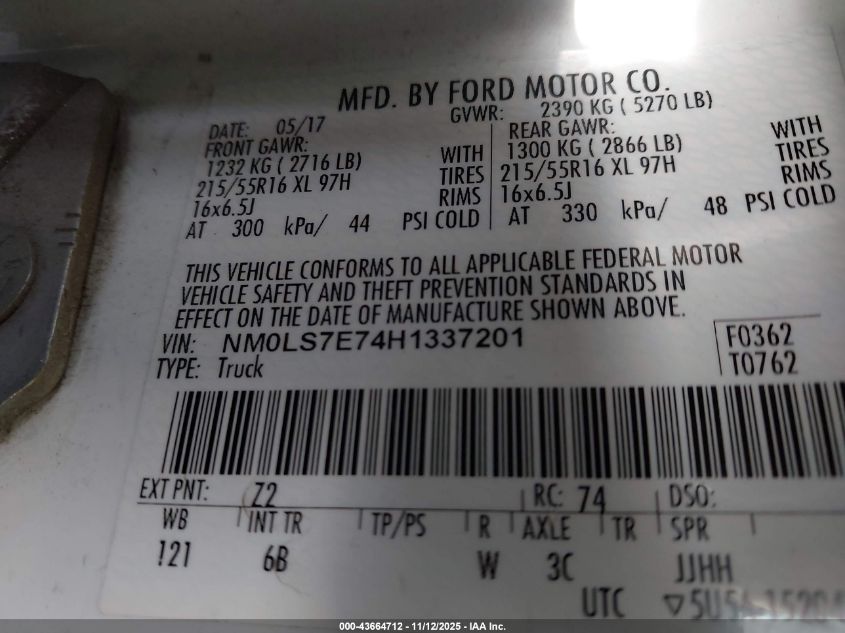 Колір БілийЦиліндри 4Привід Передній привідVIN NM0LS7E74H1337201Стан Заводиться та їде (перевірено)Ушкодження Передня або задня AutoRIA