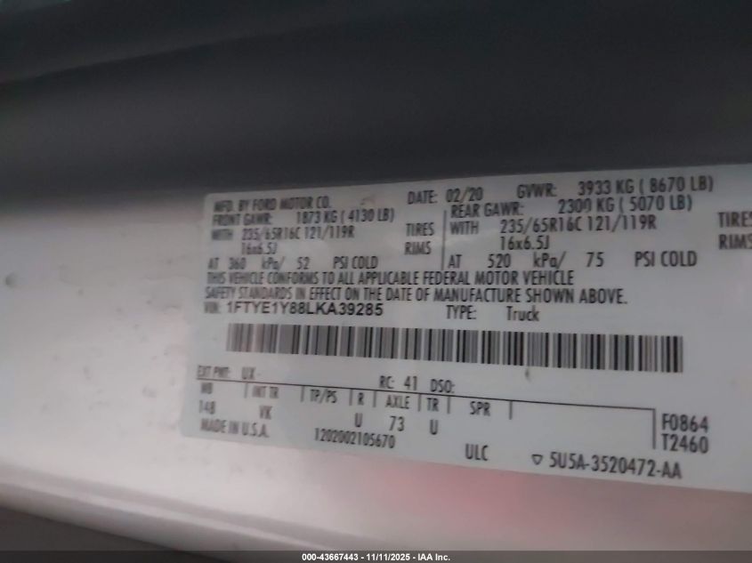 2020 FORD TRANSIT 2020 року Бензин, 3.5, Задній привід, vin - 1FTYE1Y88LKA39285 з США