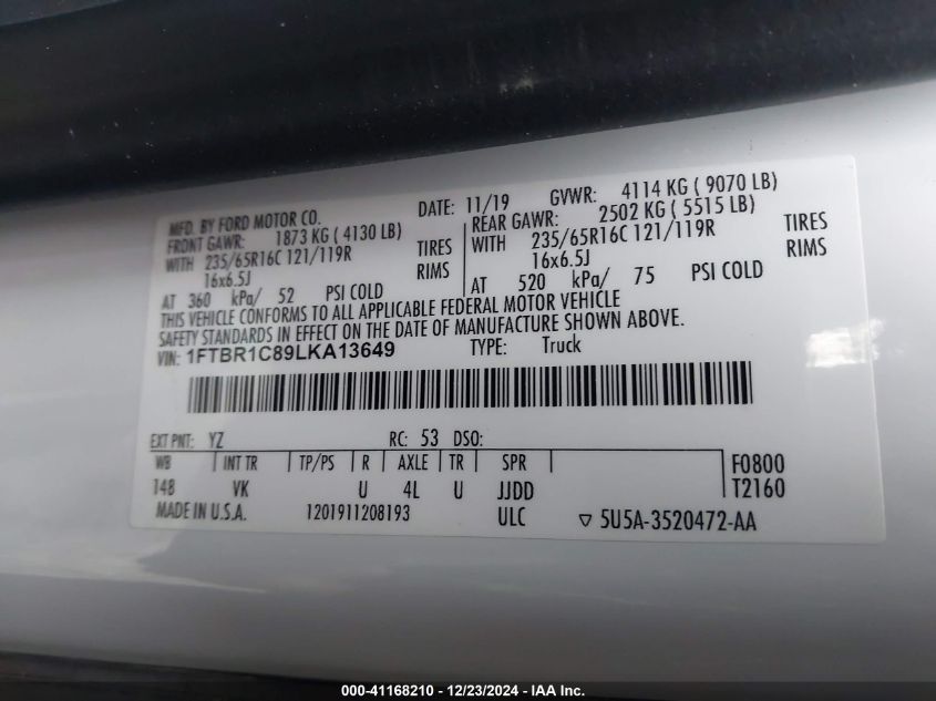 2020 FORD TRANSIT 2020 року Бензин, 3.5, Задній привід, vin - 1FTBR1C89LKA13649 з США
