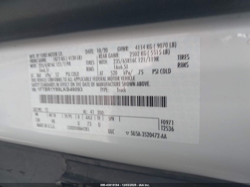 2020 FORD TRANSIT 2020 року Бензин, 3.5, Задній привід, vin - 1FTBR1Y89LKB49093 з США