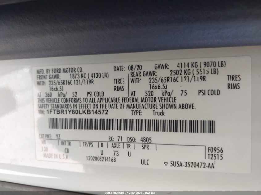 2020 FORD TRANSIT 2020 року Бензин, 3.5, Задній привід, vin - 1FTBR1Y80LKB14572 з США