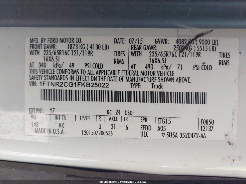 2015 FORD TRANSIT 2015 року Бензин, 3.5, Задній привід, vin - 1FTNR2CG1FKB25022 з США