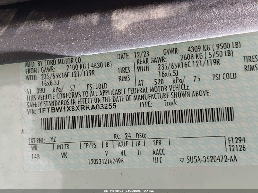 2024 FORD TRANSIT 2024 року Бензин, 3.5, Задній привід, vin - 1FTBW1X8XRKA03255 з США