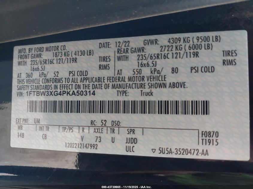 Колір ЧорнийЦиліндри 6Привід Задній привідVIN 1FTBW3XG4PKA50314Стан СтаціонарноУшкодження По всьому авто