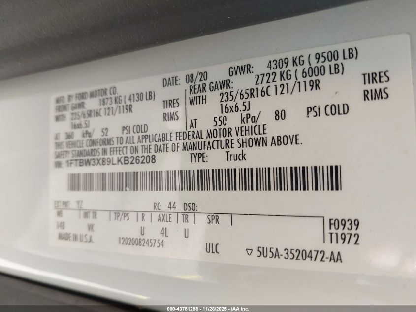 Колір БілийЦиліндри 6Привід Задній привідVIN 1FTBW3X89LKB26208Стан Заводиться та їде (перевірено)Ушкодження По всьому авто AutoRIA