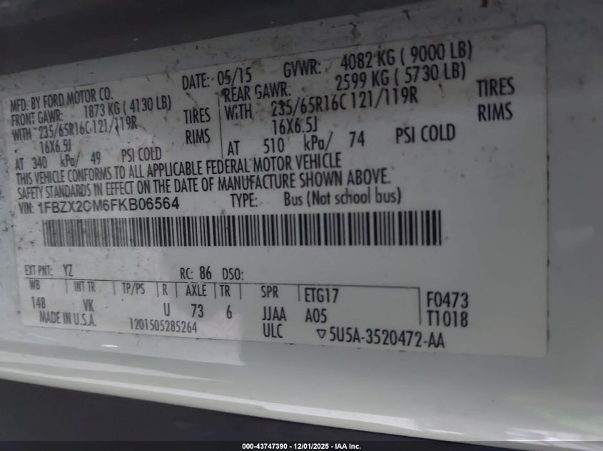 2015 FORD TRANSIT 2015 року Бензин, 3.7, Задній привід, vin - 1FBZX2CM6FKB06564 з США