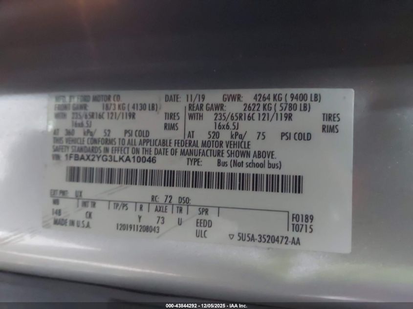 2020 FORD TRANSIT 2020 року Бензин, 3.5, Задній привід, vin - 1FBAX2YG3LKA10046 з США
