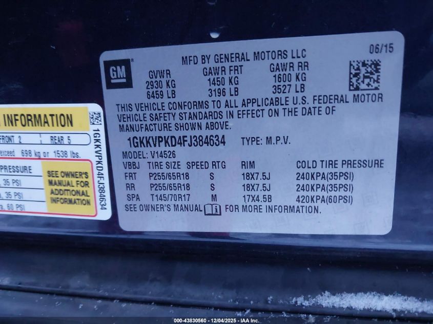 Колір СинійЦиліндри 6Привід Повний привідVIN 1GKKVPKD4FJ384634Стан Заводиться та їде (перевірено)Ушкодження Передня або задня AutoRIA