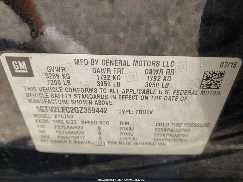 2016 GMC SIERRA 1500 2016 року Бензин, 5.3, Повний привід, vin - 1GTV2LEC2GZ359442 з США