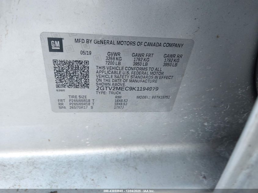 Колір СрібнийЦиліндри 8Привід Повний привідVIN 2GTV2MEC9K1194979Стан СтаціонарноУшкодження Низ