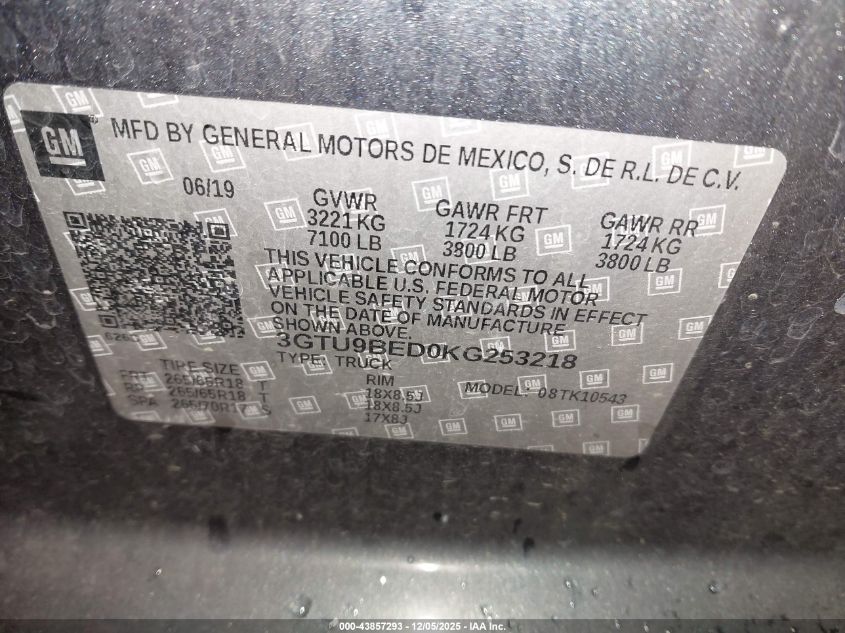 2019 GMC SIERRA 1500 2019 року Бензин, 5.3, Повний привід, vin - 3GTU9BED0KG253218 з США