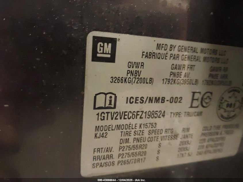 2015 GMC SIERRA 1500 2015 року Бензин, 5.3, Повний привід, vin - 1GTV2VEC6FZ198524 з США