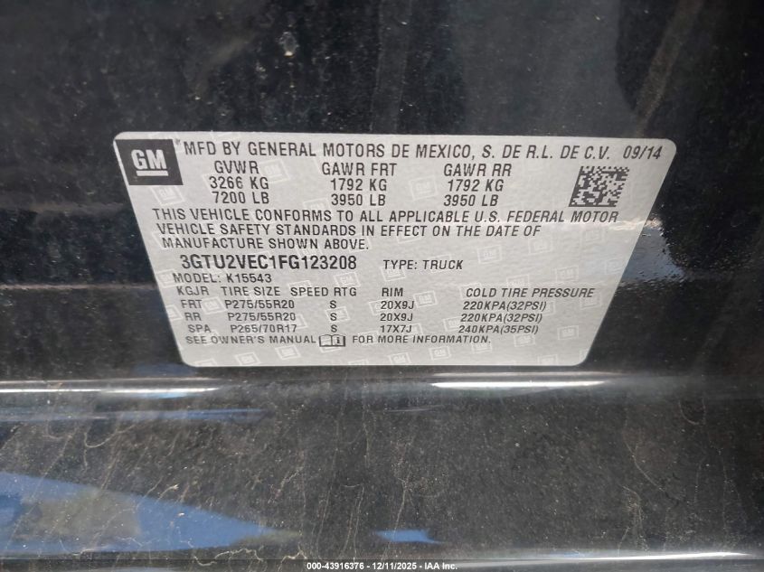 2015 GMC SIERRA 1500 2015 року Бензин, 5.3, Повний привід, vin - 3GTU2VEC1FG123208 з США