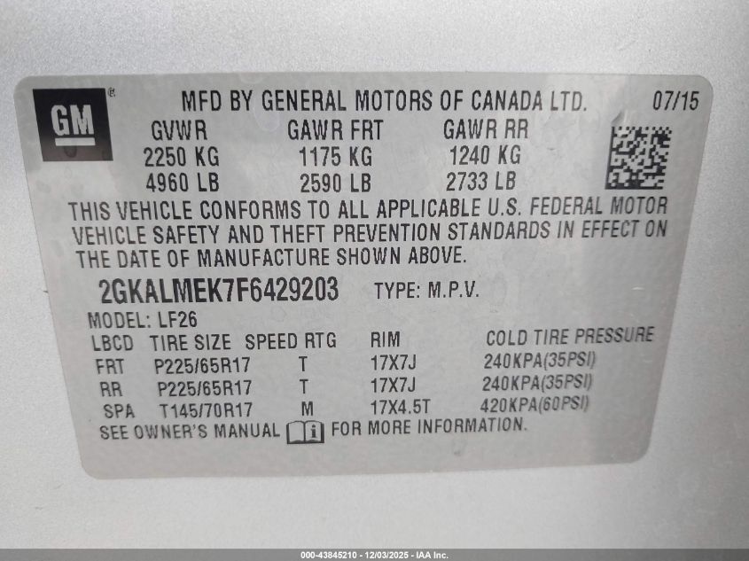 2015 GMC TERRAIN 2015 року Бензин, 2.4, Передній привід, vin - 2GKALMEK7F6429203 з США