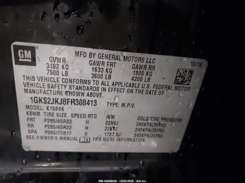 2015 GMC YUKON 2015 року Бензин, 6.2, Повний привід, vin - 1GKS2JKJ8FR308413 з США