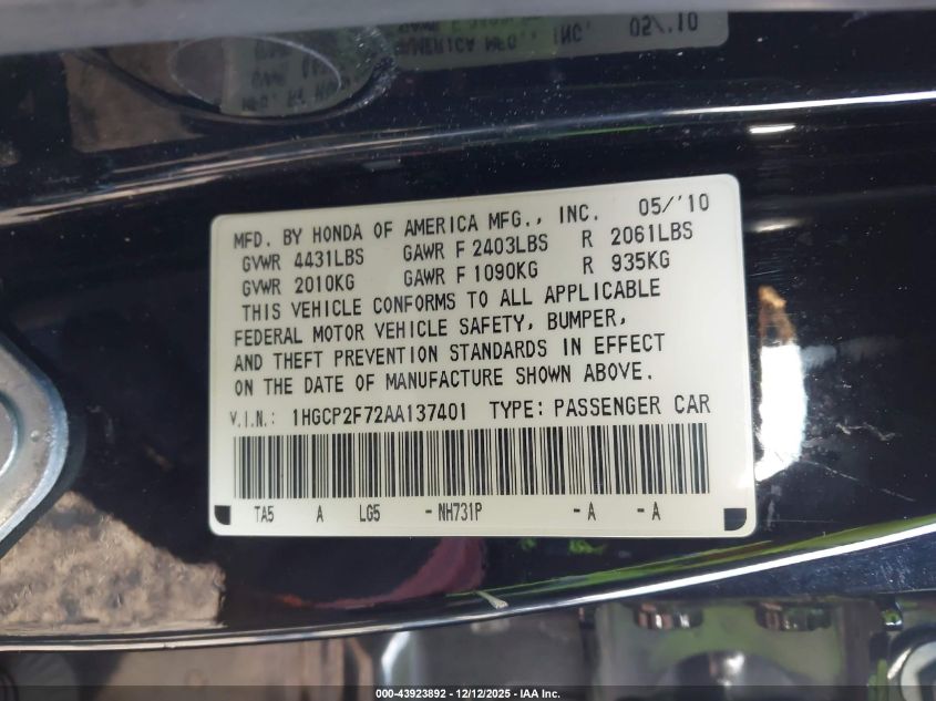 2010 HONDA ACCORD 2010 року Бензин, 2.4, Передній привід, vin - 1HGCP2F72AA137401 з США