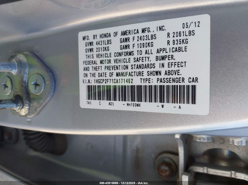 2012 HONDA ACCORD 2012 року Бензин, 2.4, Передній привід, vin - 1HGCP2F71CA171462 з США