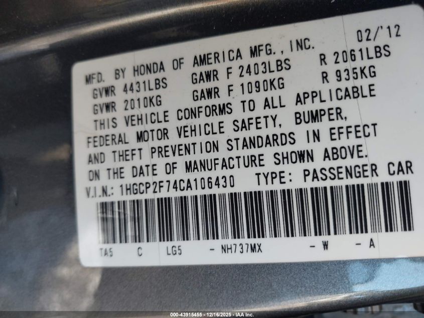 2012 HONDA ACCORD 2012 року Бензин, 2.4, Передній привід, vin - 1HGCP2F74CA106430 з США