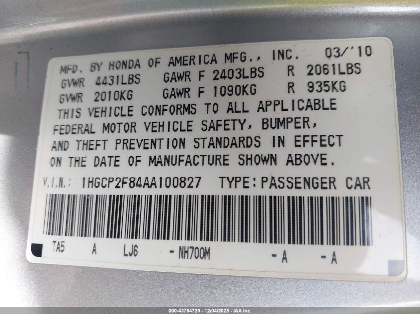 2010 HONDA ACCORD 2010 року Бензин, 2.4, Передній привід, vin - 1HGCP2F84AA100827 з США
