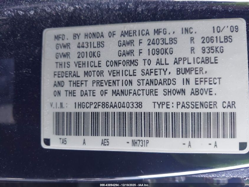 2010 HONDA ACCORD 2010 року Бензин, 2.4, Передній привід, vin - 1HGCP2F86AA040338 з США