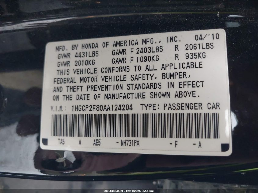 2010 HONDA ACCORD 2010 року Бензин, 2.4, Передній привід, vin - 1HGCP2F80AA124204 з США