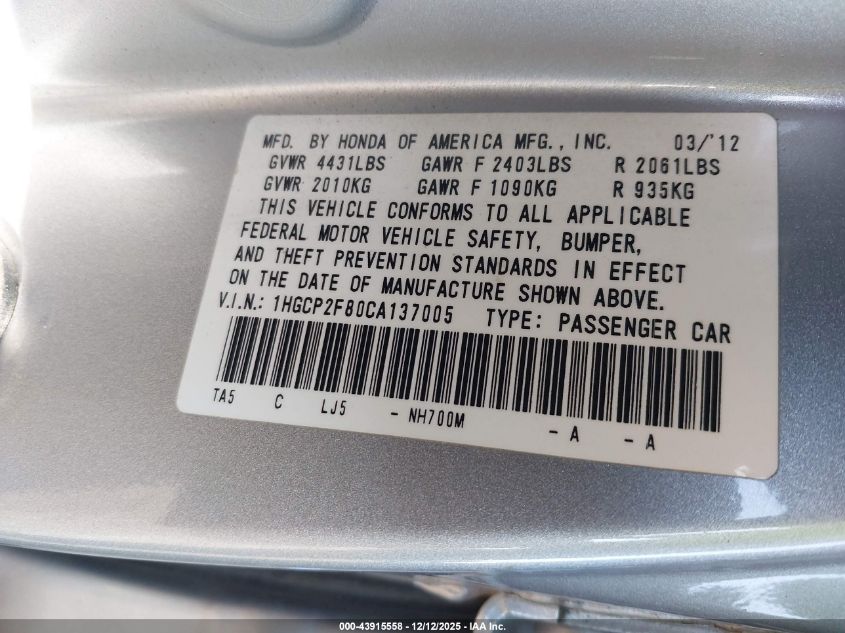 2012 HONDA ACCORD 2012 року Бензин, 2.4, Передній привід, vin - 1HGCP2F80CA137005 з США