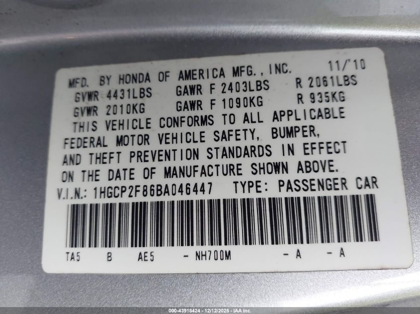 2011 HONDA ACCORD 2011 року Бензин, 2.4, Передній привід, vin - 1HGCP2F86BA046447 з США