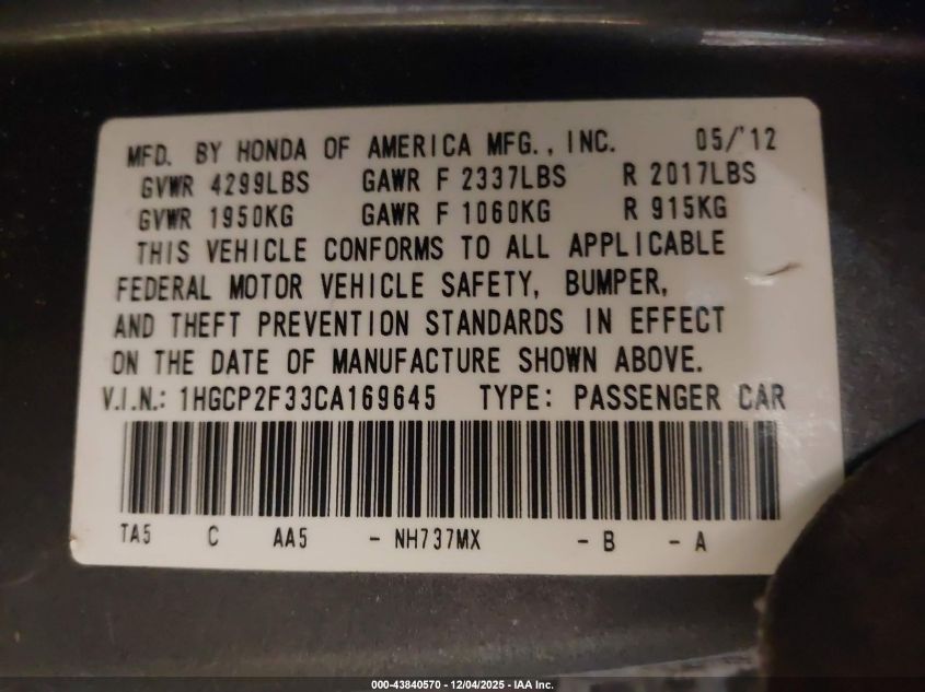2012 HONDA ACCORD 2012 року Бензин, 2.4, Передній привід, vin - 1HGCP2F33CA169645 з США