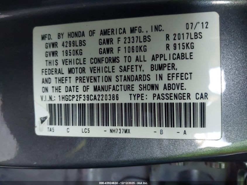 2012 HONDA ACCORD 2012 року Бензин, 2.4, Передній привід, vin - 1HGCP2F39CA220386 з США