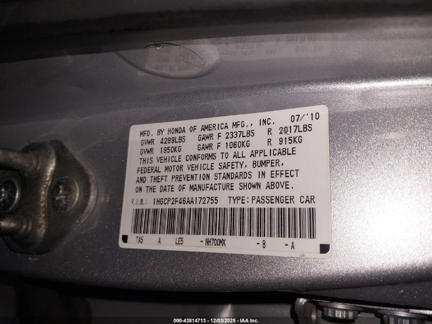 Колір СрібнийЦиліндри 4Привід Передній привідVIN 1HGCP2F46AA172755Стан СтаціонарноУшкодження Передня і задня AutoRIA