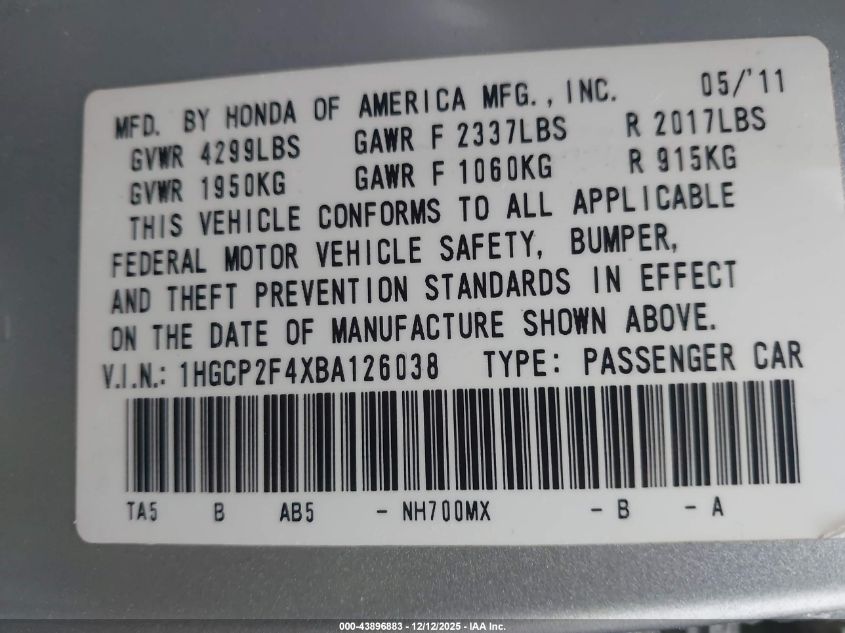 2011 HONDA ACCORD 2011 року Бензин, 2.4, Передній привід, vin - 1HGCP2F4XBA126038 з США